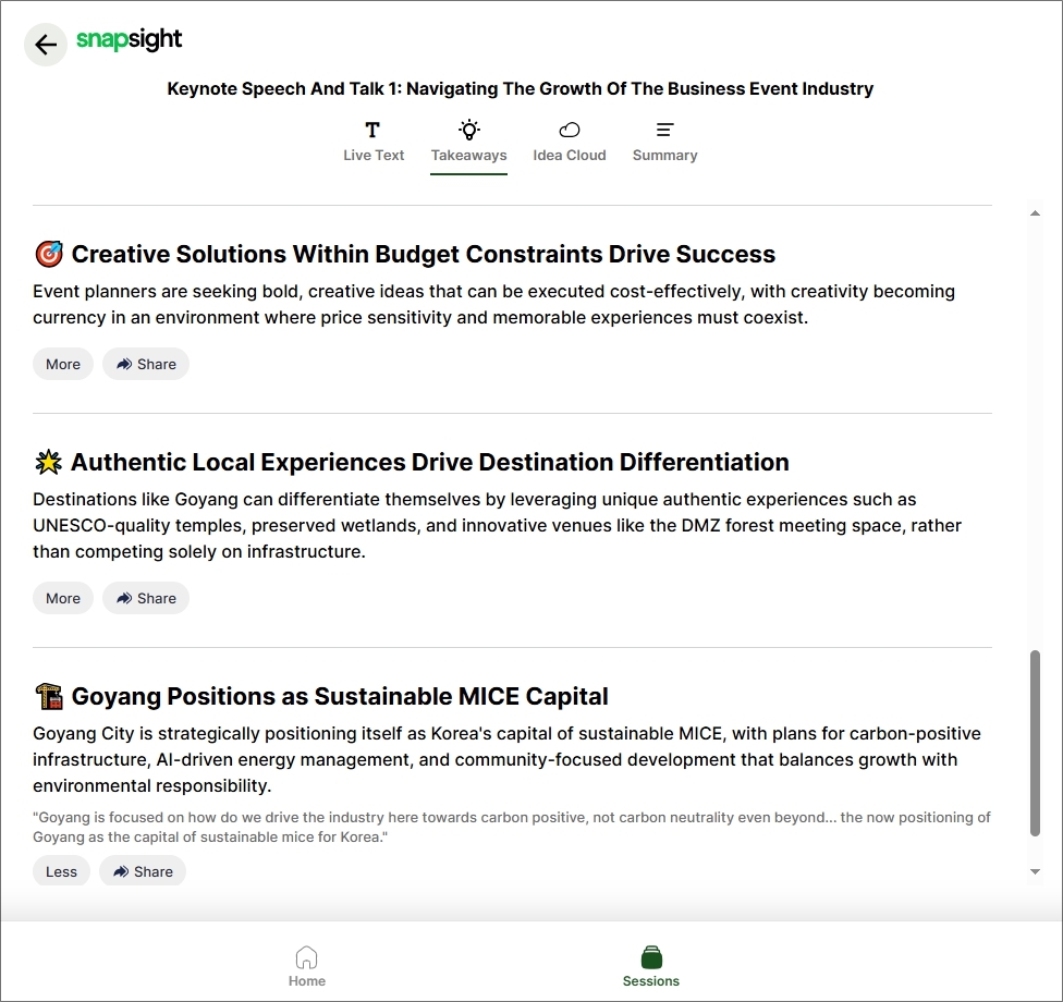 이번 행사에서 다루어진 내용을 좀 더 자세히 다시 살펴보고 싶은 분들은 AI 기반으로 행사 내용을 요약해주는 솔루션 Snapsight에서 확인하실 수 있습니다!