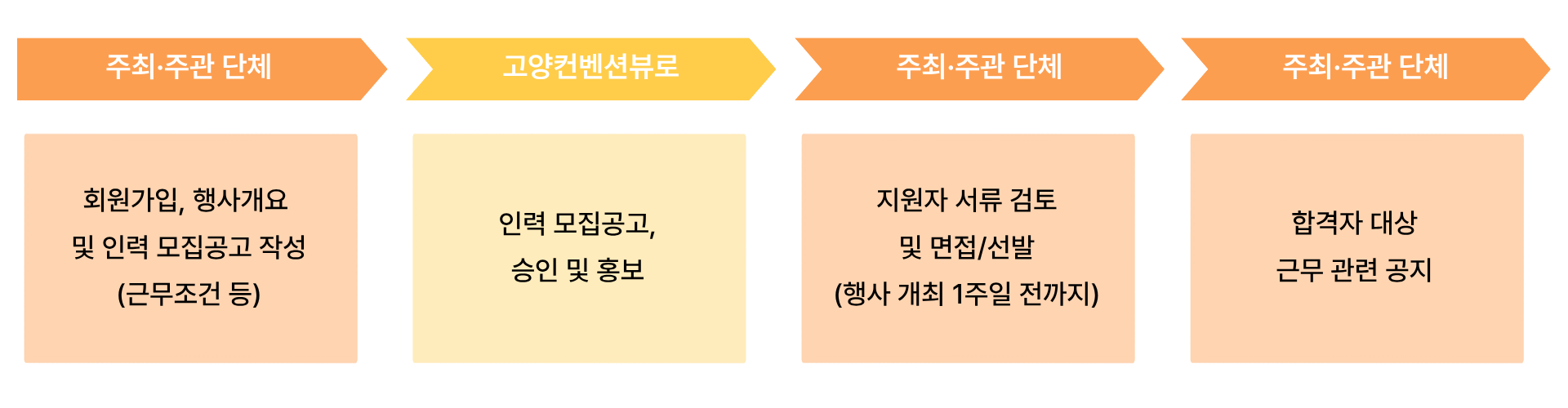 지원절차 | 지원신청 기간 : 연간 상시접수 지원신청 시기 : MICE 행사 개최 최소 3주 전 지원신청 방법 : 고양 MICE 지원신청 시스템(support.goyangcvb.com) 통해 신청 → MICE 전문인력 지원 ![]() |